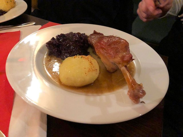 5 knusprige Gänse, mit 'Liebe' gedrehte Kartoffelklöße und leckeres Apfelrotkraut.