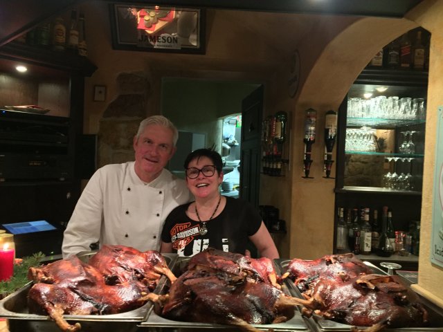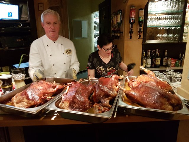 5 knusprige Gänse, mit 'Liebe' gedrehte Kartoffelklöße und leckeres Apfelrotkraut.